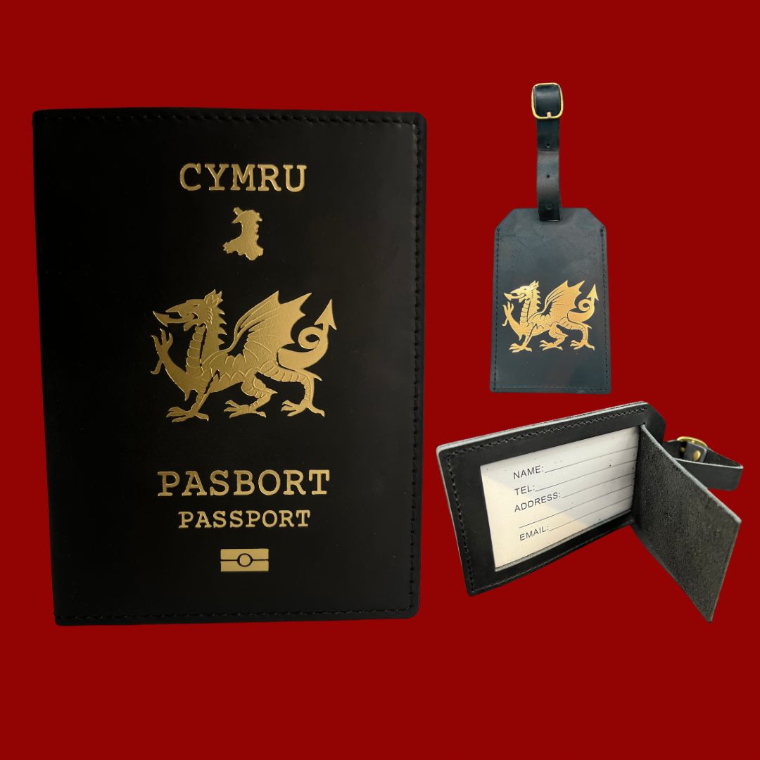Black Leather Welsh Passport Travel Wallet & Luggage Tag Set